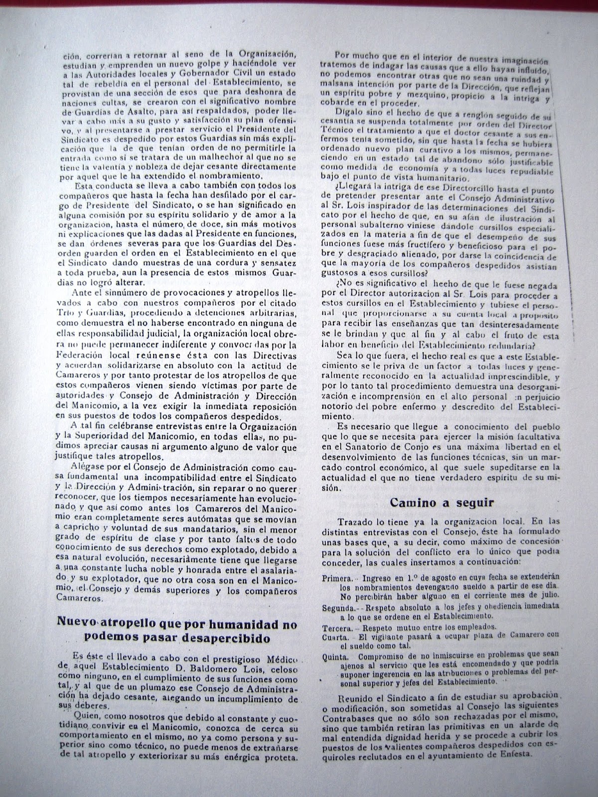 Los pasquines de la CNT editados con motivo de la huelga denuncian la situación existente. A continuación reproducimos elgunos trozos del artículo publicado en el diario “CNT” en octubre de 1933, y firmado por Federico Lamela ( ingresado en el propio centro) en en el que denuncia de las condiciones asistenciales en las que se encontraban los enfermos, al tiempo que ilustra muy bien algunas de las líneas maestras del conflicto obrero solicitando además la intervención de los Ministerios implicados.